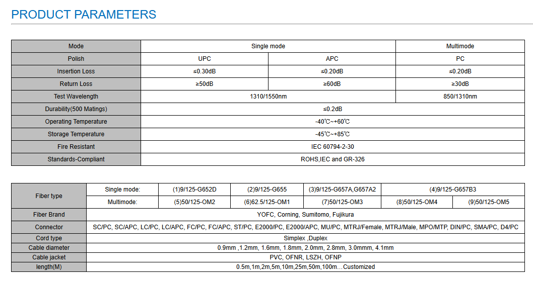 Our fiber optic patch cords come in both single-mode and multimode options. Each is built with a high-precision zirconia ceramic ferrule, pre-polished to PC, UPC, or APC standards with a convex spherical end.