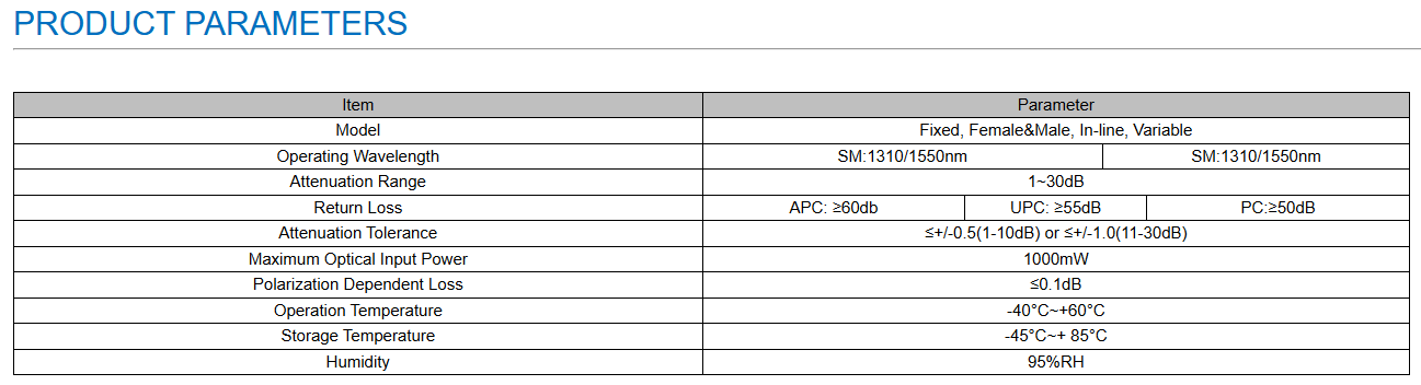 Our attenuators are manufactured with high-quality doped fiber to ensure precise attenuation. Single-mode attenuators operate within a 1250–1600 nm wavelength range, covering the common 1310 nm and 1550 nm bands. They support a maximum transmission power of 1 watt.